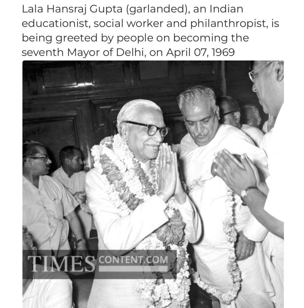 It was then when I realised not only was he awarded Padam Bhushan by the Government of India in 1970 for his services to the Society but also that he was a renowned Freedom Fighter having been imprisoned a number of times during the British Raj and more significantly during the Satyagraha movement. It is then that I realised his devotion and contributions to the Free India. He was one of the founding members of the Rashtriya Swayamsevak Sangh and in fact became the Prant Sanghchalak for Delhi in the year 1947. Babuji also served as the seventh Mayor of Delhi and it’s a matter of pride for me and the entire family that till date Hansraj Marg in Greater Kailash is named after him to serve his memory. He was a renowned educationist, social worker and philanthropist. He was also the founding force behind the ‘Child Education Society’ under which the Bal Bharti Public School network was established. His leadership qualities, discipline, compassion and nation building vision inspires and guides generations even till date.